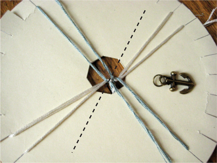Example: For the smaller anchor charm I am making an 8 strand braid which means I will have 4 lengths of floss folded in half. Therefore I need 4 strands of floss to test with.  After testing my anchor charm in the loop and determining I can put the charm in and take it out I measure the loop and find out it takes about 1″ (2.5cm) to make a successful loop.