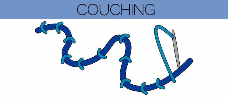 Couching is an embroidery technique where one fiber is laid across the surface of the support fabric and another thread is used to stitch over it to secure it in place. The surface fiber is often something special – too thick to stitch through the fabric, a delicate metallic thread, etc. The surface fiber can be laid out in a random pattern as shown, used to outline a motif, spiraled, aligned in rows, or in any number of other designs. The thread used to stitch over it can also be random or it can be carefully placed to create patterns. The ends of the surface fiber can be drawn through to the back of the fabric or left in the front.