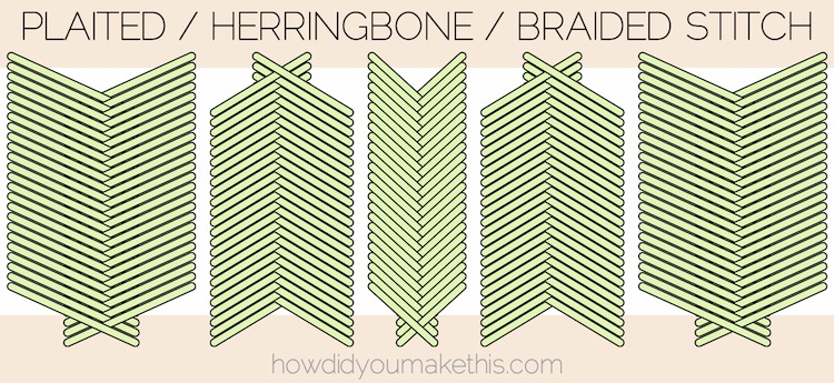 This stitch is variably known as “plaited stitch” “herringbone stitch” and “braided stitch” but whatever you call it, it’s incredibly useful in decorative stitching projects. It can be tapered to give a feather like effect, used as a border, or stitched to cover the joining of two fabrics/ribbons/etc.