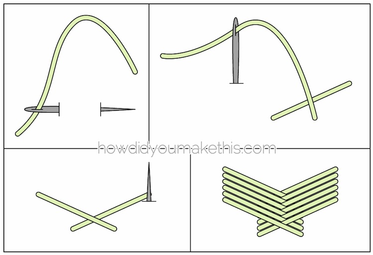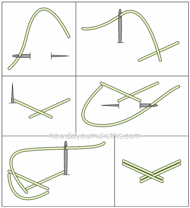 Make the stitches shown in the first version. Then, instead of going back to where you started, stitch up on the left side. Stitch across at the bottom in the opposite direction as the first time – right then left this time. Don’t pull the thread all the way up. Make sure the loop of thread is below everything you’re stitching, and take the final stitch on the right. When you pull it up tight it will look identical to the stitches before.