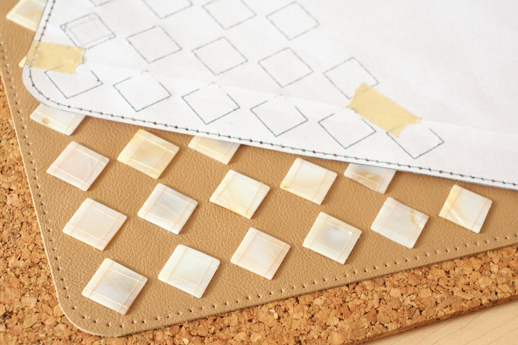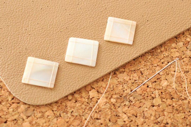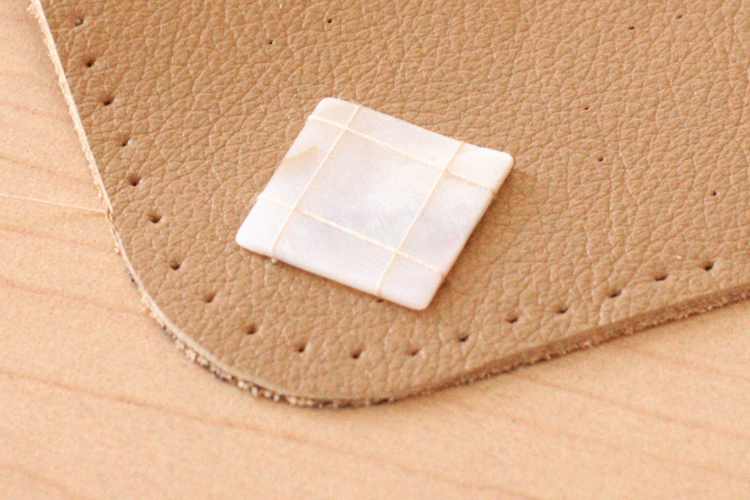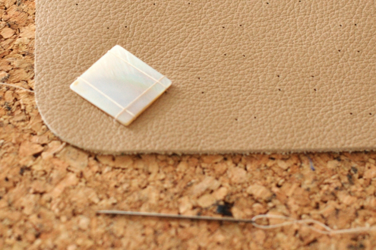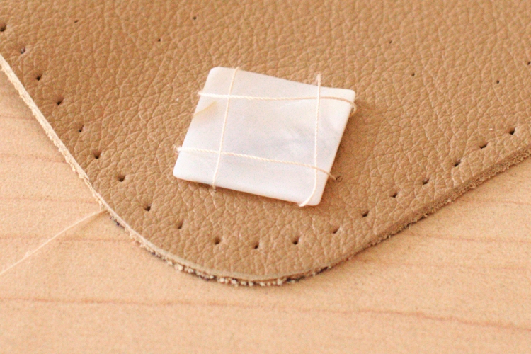 Wandering through the aisles of a craft store can lead to all sorts of inspiration. Some objects are designed for one type of craft project seem destined to be used in another area. Sewing decorative charms like the bag of mother-of-pearl chips I found located with the mosaic/glass working stuff is be a beautiful way to create a new texture on a leather bag. But how do you attach something like this (with no holes or facets) to fabric?