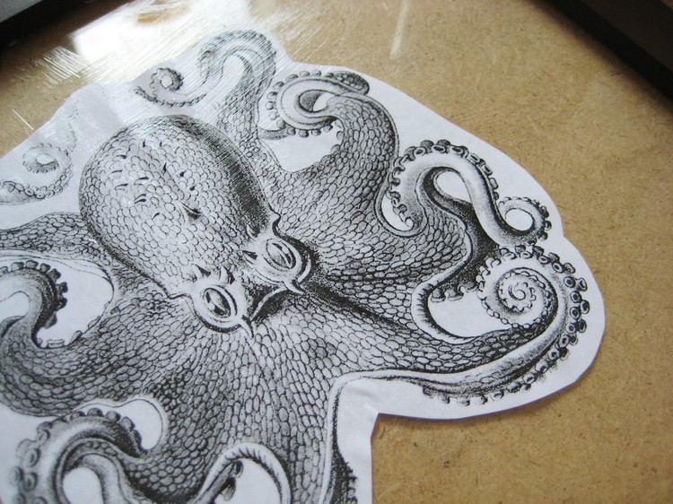 Brush a VERY thin coat of acrylic gloss medium over the image. It’s okay if the image doesn’t end up with perfect coverage and if the acrylic runs off the edge onto the glass. Thin coverage is the key. Acrylic mediums contain water and water makes paper warp. Applying a thin coat minimizes warping and seals the surface of the paper. Allow to dry completely.
