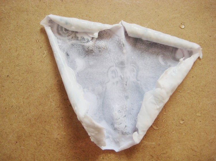 Place the transfer in water. You’re doing this to soften the paper. Leave it in for at least several hours, overnight is fine. The acrylic will turn cloudy or opaque, but that’s nothing to worry about.