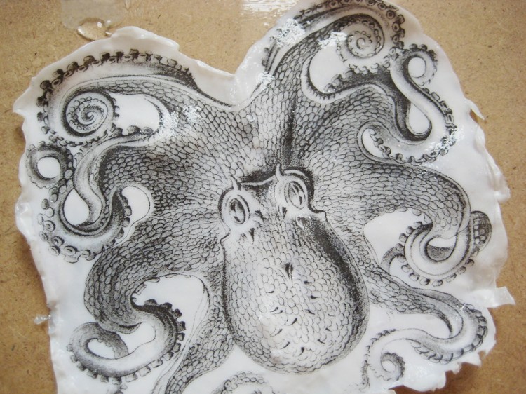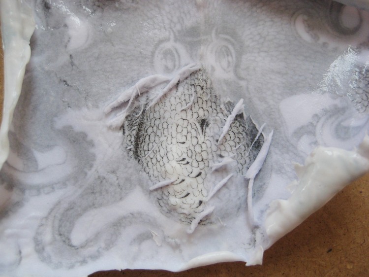 When it’s clear again you’ll probably notice a paper haze. We can fix it. Brush a bit of water over the paper side, the paper will disappear (you can see where I’ve brushed water in the picture.) When the surface is wet brush a small amount of gloss medium over it, this will soak in and keep it clear forever.